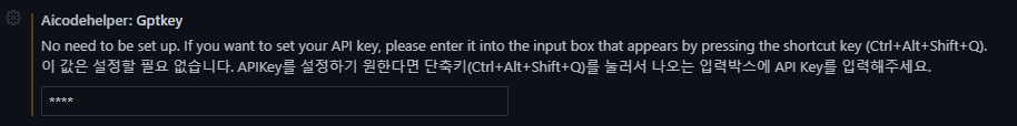 setting에 들어가서 AICodeHelper 익스텐션을 찾아 발급받은 키를 넣어준다.